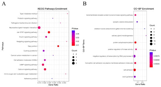 KEGG pathway enrichment analysis was performed on the selected DEGs, with the results demonstrating that the DEGs were significantly enriched in 15 signaling pathways, including those related to type II diabetes mellitus, prolactin signaling pathway, pathogenic Escherichia coli infection, and others (Supplementary Table S3, Figure 3A). Furthermore, our analysis revealed that ATP2B2, CLDN1, EGFR, SOCS7, and other genes were among the top pathways identified. However, no statistical significance was demonstrated in their survival curves (p > 0.05) (Supplementary Figure S3). Additionally, NLGN4Y, which is among the top ten downregulated genes, has been implicated in cell adhesion molecules (CAMs).