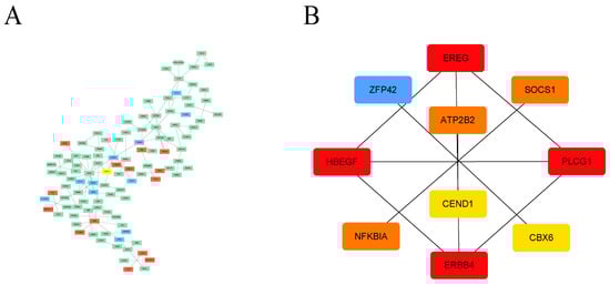 PPI analysis of DEGs based on Cytoscape. (A) Visualized PPI analysis of DEGs; red indicates that the gene expression level is increased, green indicates that the gene expression level is decreased, and blue indicates that the gene expression level has no significant difference. (B) Interconnections of 10 hub genes; darker color represents higher DMNC scores.