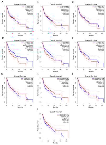 Survival analysis for hub genes. (A–J) show overall survival rate of ten hub genes.