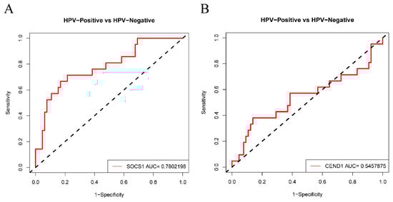 The results of the GEPIA analysis indicated that elevated expression levels of SOCS1 and CEND1 were significantly correlated with increased overall survival rates in comparison to diminished expression levels of these genes (p < 0.05). Conversely, heightened expression levels of HBEGF and ZFP42 were significantly associated with decreased overall survival rates in comparison to reduced expression levels of these genes (p < 0.05). However, the expression levels of the remaining six hub genes did not demonstrate a significant correlation with the prognosis of HNSCC (p > 0.05) (Figure 5). Therefore, there is a statistically significant association between overall survival and SOCS1 expression in patients with HNSCC. ROC curves were drawn to assess the predictive value of SOCS1 and CEND1 for HPV infection. The results showed that the area under the curve (AUC) for SOCS1 was 0.7802198, indicating a superior diagnostic capacity in comparison to CEND1 (Figure 6).