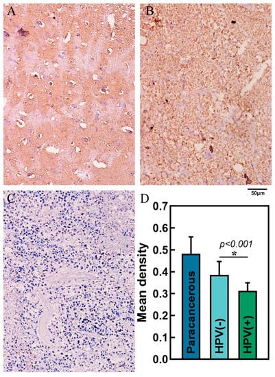 Immunohistochemistry and mean density in different tissues. (A) Paracancerous tissue, (B) HPV-negative HNSCC tissue, (C) HPV-positive HNSCC tissue—scale bar, 50 μm. (D) Mean density of paracancerous, HPV-negative HNSCC tissue and HPV-positive HNSCC tissue.