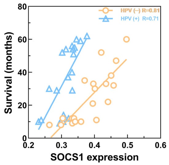 Correlation between SOCS1 expression and patient survival. R = 0.822 in HPV-positive HNSCC tissues; R = 0.843 in HPV-negative HNSCC tissues (p < 0.001).