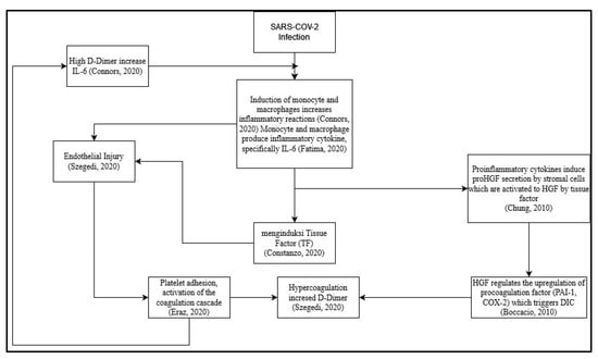In the proposed schematic (Figure 1), infection from SARS-CoV-2 can trigger an inflammatory process in the body []. The inflammatory process during SARS-CoV-2 infection is induced by monocytes and macrophages []. The induction of monocytes and macrophages triggers the emergence of proinflammatory cytokines, especially IL-6 []. Proinflammatory cytokines induce proHGF secretion by stromal cells, which are then activated by Tissue Factor to become HGF []. HGF regulates the upregulation of pro-coagulation factors (PAI-1&COX-2), which trigger disseminated intravascular coagulation (DIC) []. IL-6 cytokines induce Tissue Factor [] and cause endothelial injury []. The occurrence of DIC causes hypercoagulation and increases the concentration of D-dimer []. The occurrence of endothelial injury causes platelet adhesion, thereby activating the coagulation cascade []. Hypercoagulation causes high D-dimer concentrations, thereby increasing IL-6 concentrations [].