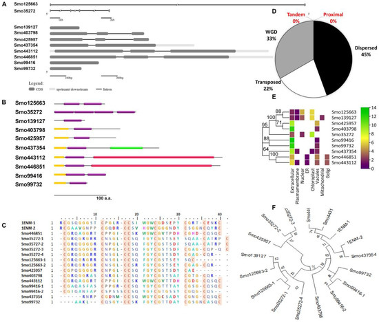 Characterization of Hevein-like homologs from Selaginella moellendorffii. (A) Gene structure and (B) domain architecture (Hevein domains = purple boxes (PF00187), red domain = chitinase class I (PF00182), green domain = lytic transglycosylase domain (PF03330), and yellow domain = signal peptide). (C) Multiple sequence alignment of trimmed Hevein domains (red box = conserved cysteine residue) and (D) the duplication of the Hevein genes and the mechanism type. (E) Predicted subcellular localization of Hevein-like homologs and (F) phylogenetic tree of trimmed Hevein domains and their evolutionary relationship (bootstrap 1000, the lectin ID and accession numbers are followed by the number of the domains which reside in the same protein and indicated after the dash). Urtica dioica agglutinin (1ENM) was used as a reference for alignment and phylogenetic analysis.