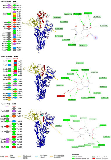 Using Knowledge-based FADE and Contacts 2 (KFC-2), the hotspot residues and/or clusters were predicted at the interface between S protein and lectins. The values from the KFC-a model were used as their predictability outcomes that were superior to those of the KFC-b model because it is based on interface solvation, atomic density, and plasticity features, as indicated earlier [53]. Specifically, residues Gln25, Asp21 from Smo446851, Smo125663 residues Arg91 and Gln11, and the Smo99732 Asp25 were identified as hotspot residues and reported higher KFC-2-a scores compared to other residues (Supplementary File Figure S5). Complimentary hotspot residues Val367, Asp364, Lys386, Gln115, and Thr109 were identified as hotspot residues on S glycoprotein.