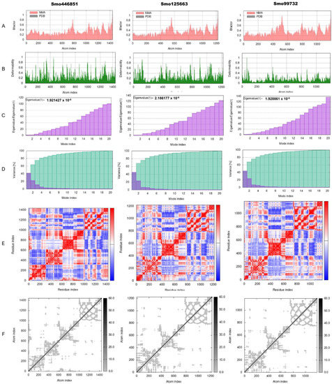 Normal-state analyses via iMODS server for the docked lectins (Smo446851, Smo125663, and Smo99732)–spike protein complexes. (A) B-factor indices, (B) deformability plot (the peaks indicated the non-rigid regions of the complexes), (C) eigenvalues, (D) variance plot (individual variances are purple, while cumulative variances are green), (E) covariance map (correlated (red), uncorrelated (white), or anti-correlated (blue) motions), and (F) elastic network analyses (darker grey regions indicate stiffer regions of the complex).
