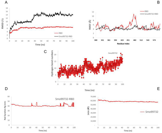 Molecular dynamic simulation (MDS) for the spike protein’s RBD complexed with Smo99732. (A) RMSD, (B) RMSF, (C) number of hydrogen bonds, (D) radius gyration, and (E) SASA.