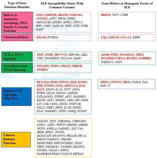 - Alperin, J.M.; Ortiz-Fernández, L.; Sawalha, A.H. Monogenic Lupus: A Developing Paradigm of Disease. Front. Immunol. 2018, 9, 2496. [Google Scholar] [CrossRef] [PubMed]