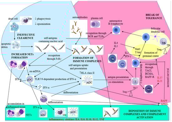 Hypothetical model of polygenic SLE development: adaptive immune disorders lead to the generation of autoantibodies, specifically antibodies targeting self-antigens (right side of the figure, marked in pink). These autoantibodies progressively accumulate as a consequence of the innate immune dysfunction (left side of the figure, marked in blue). Modified according to reference [121]. APRIL: a proliferation-inducing ligand; B: B-cell; BAFF: B-cell-activating factor; BAFF-R: B-cell-activating factor receptor; BCMA: B-cell maturation antigen; BCR: B-cell antigen receptor; FcRγ: Fc receptor-γ; HLA class II: human leucocyte antigen class II; mDC: myeloid dendritic cell; Mϕ: macrophage; NET: neutrophil extracellular trap; ox-mDNA: oxidized mitochondrial DNA; pDC: plasmacytoid dendritic cell; Stat1: signal transducer and activator of transcription (a transcription factor); T: T-cell; TACI: transmembrane activator, calcium modulator and cyclophilin ligand interactor; T-bet: a T-box transcription factor; Tfh: T follicular helper; TLR7/9: Toll-like receptors 7 and 9.