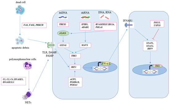 RNASEH2A, RNASEH2B, and RNASEH2C are three genes that encode the protein components of the RNaseH2 complex, an enzyme involved in breaking down RNA–DNA hybrids formed during DNA replication when they are no longer needed. Mutations in these genes cause an accumulation of ribonucleotides in genomic DNA during replication, leading to chronic DNA damage and IFN-I production [87]. Patients with these mutations exhibit cutaneous changes, photosensitivity, arthritis, lymphopenia, and autoantibody formation. RNASEH2A, RNASEH2B, and RNASEH2C mutations are inherited in a recessive manner [87].
