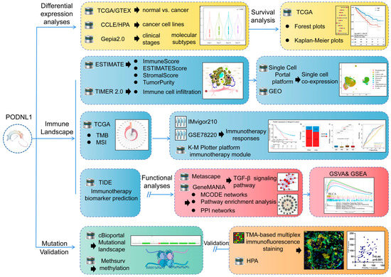 In particular, SLRPs have a class V member, named podocan-like 1 (PODNL1), which is found to be highly expressed in bone, glioma, bladder and ovarian cancers, representing a potential prognostic biomarker [14,15,16,17,18]. Its high expression together with the presence of low-methylation in its CpG sites is coupled with significantly increased expressions of PD-1, PD-L1, and CTLA4 in glioma [17]. Its overexpression in glioma cells is even believed to remarkably promote the mesenchymal-related biomarkers including vimentin, N-cadherin, snail, and fibronectin [16]. However, its prognostic values and the role in the TME have not been systematically estimated yet, especially in a pan-cancer setting. Therefore, in the present study, we performed a systematic exploration of PODNL1 through the Cancer Genome Atlas (TCGA) pan-cancer datasets, TIMER (Tumor Immune Estimation Resource), Gene Set Variation Analysis (GSVA), Gene Set Enrichment Analysis (GSEA), and the Cellminer, reconciling with the analyses of single-cell transcriptomes and immunotherapeutic cohorts in cancers, and validation by the tissue microarray (TMA)-based multiplex immunofluorescence staining in 20 types of cancer as well (Figure 1).