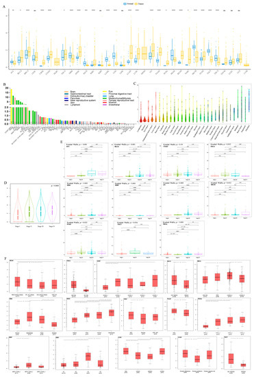 Differential expression analyses of PODNL1 among cancers. (A) Expression profiles of PODNL1 analyzed with TCGA and GTEX databases. (B) The expression levels of PODNL1 in tumor cell lines in CCLE database. (C) The expression levels of PODNL1 in 69 cell lines from the HPA database. (D) The correlations between the PODNL1 expressions and the clinical stages in 33 types of cancers. (E) The correlations between the PODNL1 expressions and the clinical stages in ACC, KIRC, KIRP, THCA, KICH, OV, BLCA, SKCM, COAD, STAD, ESCA, and TGCT. (F) The respective analyses of correlations between the PODNL1 expressions and the molecular subtypes in SKCM, THCA, SARC, BLCA, TGCT, GBM, CESC, HNSC, PAAD, LUAD, KIRP, KIRC, LUSC, THYM, and BRCA. * p < 0.05, ** p < 0.01, *** p < 0.001, **** p < 0.0001. All the abbreviations are listed in Table S1.