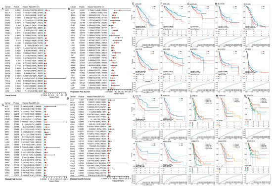 Pan-cancer survival analysis of PODNL1 using TCGA database. Through analysis using univariate cox regression, the forest plots representing the PODNL1 expressions significantly associated with the following: (A) Overall survival time in days (OS) in KIRC, LGG, BLCA, ACC, OV, LIHC, MESO and KIRP, which indicated that PODNL1 was a high-risk gene in these cancers, particularly in ACC and KIRP. (B) Progression-free survival (PFS) in LGG, GBM, KIRC, ACC, BLCA, KIRP, OV, and MESO, which indicated that PODNL1 was a high-risk gene, particularly in ACC and KIRC. (C) Disease-free survival (DFS) in HNSC and KIRP. (D) Disease-special survival (DSS) in ACC, LGG, KIRC, BLCA, GBM, KIRP, MESO, and OV. (E–N) The correlations of the high expression levels of PODNL1 with the poor OS and PFS of patients with cancers including LGG, KIRC, KIRP, BLCA, OV, ACC, MESO, GBM, PAAD metastasis and recurrence, and STAD Stage M0, analyzed by the Kaplan–Meier (K–M) method, and the ROC curves measuring their predictive diagnostic values of the PODNL1 expressions.