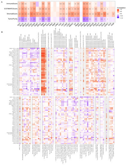 Correlation analyses between the PODNL1 expressions and the infiltration levels of immune cells among pan-cancer. (A) Heatmap of the correlations between the expression levels of PODNL1 and Immune Score, ESTIMATEScore, StromalScore, and TumorPurity, respectively. (B) Heatmap of the correlations between the expression levels of PODNL1 and immune cells evaluated by the TIMER, CIBERSORT, CIBERSORT-ABS, XCELL, EPIC, MCPCOUNTER, QUANTISEQ, and TIDE algorithms. Red showed the positive correlations and purple the negative. * p < 0.05, ** p < 0.01, *** p < 0.001.