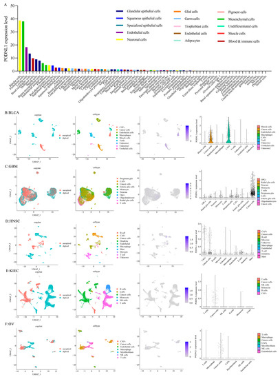 Single-cell sequencing analyzing PODNL1 co-expression in pan-cancer. (A) The expression levels of PODNL1 in cells analyzed via the single-cell transcriptomes of normal tissues in HPA datasets. (B–F) The expression levels of PODNL1 analyzed via the single-cell sequencing datasets of BLCA, HNSC, GBM, KIRC, and OV, respectively.