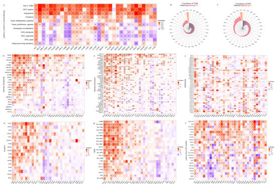 Correlations of PODNL1 expressions with the core molecules and biology pathways related to tumor immunotherapeutic responses. Correlation heatmaps: (A) Pathways (including Pan_F_TBRs, EMT markers, angiogenesis, ferroptosis, tumor inflammation signature, tumor proliferation signature, homologous recombination, G2M checkpoint, DNA replication, DNA repair and antigen-processing machinery). (B) Immune checkpoint. (C) Immunostimulator. (D) Chemokine. (E) Chemokine receptor. (F) MHC. (G) Tumor stem cell marker. (H) TMB. (I) MSI. * p < 0.05, ** p < 0.01, *** p < 0.001.