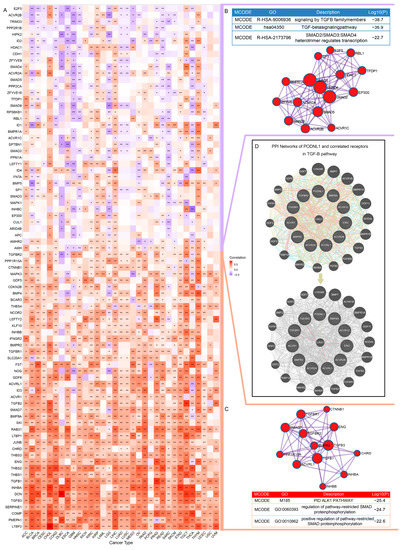 Correlations of PODNL1 expressions with TGF-β signaling. (A) The correlations between PODNL1 expressions and TGF-β signaling pathway genes. (B,C) The Metascape MCODE networks and the corresponding pathway enrichment analysis identified for positively related gene lists (in red column) and negatively ones (in purple column), respectively. (D) GeneMANIA protein–protein interaction (PPI) networks of PODNL1 were analyzed using its positively correlated receptors including TGFBR1, TGFBR2, ACVR1, ACVR1C, ACVR2A, ACVR2B, ACVRL1, BMP8A, BMPR2 and ENG. * p < 0.05, ** p < 0.01.