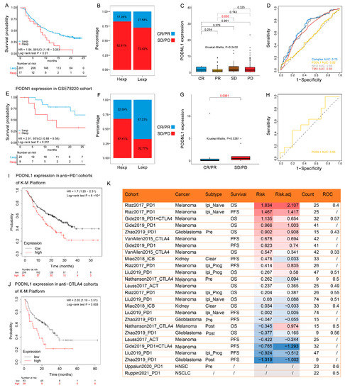 Immunotherapy responses and biomarkers related with the expression levels of PODNL1 in cancer immunotherapeutic cohorts. (A–D) The IMvigor210 cohort: (A) The K-M curve of OS. (B,C) Bar and box plots of immunotherapy responses (CR: complete response; PR: partial response; SD: stable disease; PD: progressive disease) and (D) the areas under the ROC curves (AUCs) of the PODNL1 expression, TMB, NEO, and their combination. (E–H) The GSE78220 cohort: (E) The K-M plot of OS. (F,G) Bar and box plots of immunotherapy responses (CR/PR/SD/ PD) and (H) the AUCs of the PODNL1 expressions. (I,J) The K-M curves of PODNL1 expression in immunotherapy cohorts analyzed using the K-M plotter platform: (I) Anti-PD-1 cohorts. (J) Anti-CTLA4 cohorts. (K) The correlations of high PODNL1 expressions with Risk, Risk.adj and ROC in immunotherapy cohorts enumerated in TIDE platform.