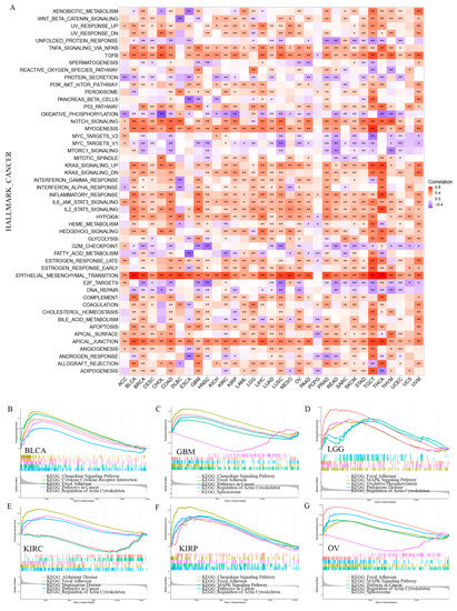 Functional analyses on PODNL1 expressions among 33 types of cancers. (A) The correlated HALLMARK_CANCER in pan-cancer analyzed via GSVA. (B–G) Correlation analyses in BLCA, GBM, LGG, KIRC, KIRP, and OV via GSEA of KEGG. * p < 0.05, ** p < 0.01.