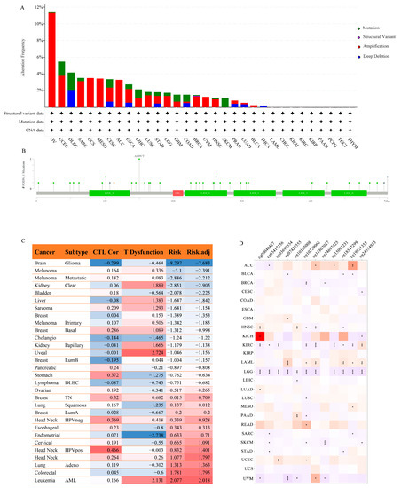 Mutational landscape and methylation of PODNL1 in pan-cancer. (A) Mutation frequency of PODNL1 in pan-cancer. (B) Mutation lollipop chart of PODNL1. (C) Correlation table of PODNL1 methylation and CTL Cor, T Dysfunction, Risk and Risk.adj in 21 types of cancers from TCGA database, analyzed using the TIDE platform. (D) Correlation heatmap of PODNL1 methylation sites and prognosis of 25 different human cancers from TCGA database, analyzed using the Methsurv platform. The red color represents a positive correlation while the purple negative. (* p < 0.05, ** p < 0.01, *** p < 0.001).