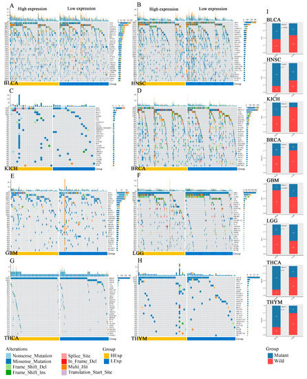 Oncoplots showed the somatic landscapes of (A) BLCA, (B) HNSC, (C) KICH, (D) BRCA, (E) GBM, (F) LGG, (G) THCA and (H) THYM tumor cohorts. Genes are ordered by their mutation frequencies, samples are ordered by disease histology, as indicated by the annotation bar. Waterfall plot shows mutation information for each gene for each sample. Color annotation of various cancer types are shown at the bottom. The bar plot above the legend shows the number of mutation burden. (I) The mutation profiles of different genes in high- and low-PODNL1-expression groups: TP53 in BLCA, HNSC, KICH, GBM and LGG, PIK3CA in BRCA, BRAF in THCA and GTF2I in THYM.