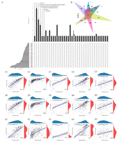 Expression correlation analysis of PODNL1 at the whole genome level in pan-cancer. (A) Upset plot showed the genes correlated with PODNL1 expressions in pan-cancer. (B) Venn plots showed the genes correlated with PODNL1 expressions in five types of cancers including BLCA, KIRC, ACC, OV and GBM. (C1–E5) The expression correlations of PODNL1 with (C1–C5) COL1A1, (D1–D5) COL5A1, and (E1–E5) LINC01614 in BLCA, KIRC, ACC, OV and GBM, respectively.