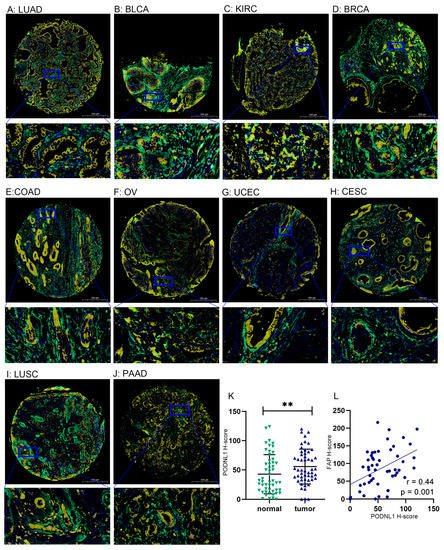 The digital image analyses of the relationship between the protein levels of PODNL1 and FAP using the TMA-based multiplex immunofluorescence staining detected from 52 paired samples of 20 types of cancer. (A–J) The merged images of the multiplex immunofluorescence staining (50× and 500×), the DAPI nuclear is stained in blue, while the protein levels of PODNL1 and FAP, respectively, are stained in yellow and green; (A) LUAD; (B) BLCA; (C) KIRC; (D) BRCA; (E) COAD; (F) OV; (G) UCEC; (H) CESC; (I) LUSC; (J) PAAD; (K) Comparison of the PONDL1 H-scores between the pairs of tumor and matched adjacent normal tissues; (L) The relationship between the PONDL1 and FAP H-scores. ** p < 0.01.