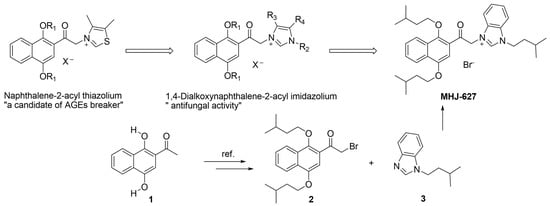 In our previous study (Figure 1), we synthesized various naphthalene-2-acyl thiazolium salts by combining the structures of 1,4-dialkoxynaphthalene and thiazole and evaluated their potential as AGE (advanced glycation end products) breakers [51]. The 1,4-dialkoxynaphthalene moiety played a significant role in their pharmacological activity. Subsequently, we replaced thiazole with an imidazole ring to produce 1,4-dialkoxynaphthalene-2-acyl imidazolium salt derivatives, which exhibited antifungal activity [22]. We further confirmed that combination with the 1,4-dialkoxynaphthalene moiety served as a good pharmacophore. After screening the activity of several 1,4-dialkoxynapthalene imidazolium salts, it was confirmed that MHJ-627 is a potent ERK5 inhibitor (Figure 1).