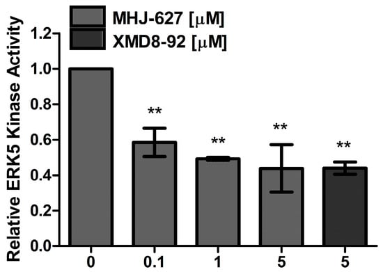 MHJ-627 reduced the kinase activity of human ERK5 in vitro. Relative ERK5 kinase activity following MHJ-627 treatment was measured via in vitro kinase assay. Kinase activity of ERK5 was reduced dose-dependently, supporting ERK5-inhibitory activity of MHJ-627 in vitro. Relative ERK5 kinase activity of the 0 μM control was set as 1. Data are presented as mean ± SD. Each experiment was performed in duplicate and repeated at least three times. One-way ANOVA (** p < 0.01) was used for significance. All values were compared to the 0 μM control value to determine the significance.