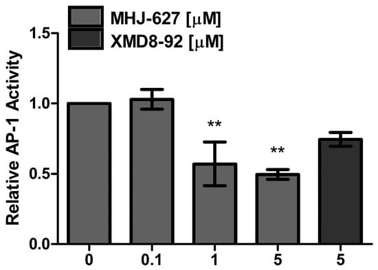 To further examine the ability of MHJ-627 to inhibit the kinase activity of human ERK5 in cells, activation of activator protein-1 (AP-1), a downstream transcription factor of ERK5, was measured via a luciferase reporter [36]. HeLa cells were transfected with a plasmid bearing an AP-1 response element followed by a luciferase reporter gene and the mRNA level of luciferase was measured using quantitative real-time PCR (qRT-PCR). As the AP-1 transcription factor is a downstream target of ERK5, even though it is also a downstream of ERK1/2, it is often used to evaluate the alteration in ERK5 activity in cells [53]. Since ERK5 is often dysregulated in cancers, AP-1 is also found in a hyperactivated form in tumor cells [54,55]. The mRNA of luciferase transcribed by the AP-1 transcription factor decreased in a dose-dependent manner (Figure 4), signifying hindered AP-1 activation by ERK5 following MHJ-627 and XMD8-92 treatment [56]. This result suggests that MHJ-627 successfully inhibits ERK5 both in vitro and at the cell level.