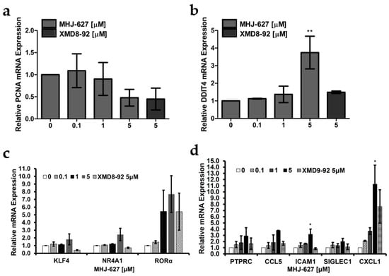 qRT-PCR was performed to assess the expression of genes that are previously reported to be regulated or influenced by ERK5 in the gene expression analyses of ERK5 signaling though they are not the established direct targets of ERK5 [57]. As previously reported, downregulation of proliferating cell nuclear antigen (PCNA) expression is a known effect of ERK5 inhibition or ablation. Consistently, we observed a decrease in mRNA expression of PCNA, which is involved in DNA replication and repair machinery (Figure 5a) [58,59,60]. In contrast, as illustrated by previous literature, the mRNA level of DNA damage-inducible transcript 4 (DDIT4), which acts as a negative regulator of the mammalian target of rapamycin (mTOR) pathway, was elevated (Figure 5b) [57,61]. Furthermore, we observed increases in mRNA expression of the genes that can be categorized into two groups based on the function of the proteins they encode: transcription factors and immune-related proteins. The mRNA expression of KLF transcription factor 4 (KLF4), nuclear receptor subfamily 4 group A member 1 (NR4A1) and retinoic acid receptor-related orphan receptor-alpha (RORα), which act as transcription factors, was upregulated (Figure 5c). There was an increase in mRNA expression of protein tyrosine phosphatase receptor type C (PTPRC), C-C motif chemokine ligand 5 (CCL5), intercellular adhesion molecule 1 (ICAM1), sialic acid binding Ig like lectin 1 (SIGLEC1), and C-X-C motif chemokine ligand 1 (CXCL1), which all are related to immunity (Figure 5d). Since an activation of immune cells and immune responses following ERK5 inhibition has been reported, we speculate that this increase in expression is due to a feedback loop of the signal transduction pathway [11]. The decrease in PCNA mRNA and increase in DDIT4 and CXCL1 mRNA, which have been reported to occur when ERK5 is inhibited, are evidence that MHJ-627 effectively targets ERK5 [58].