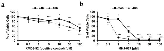 MHJ-627 had an anti-proliferative effect through inhibition of ERK5. (a) Effect of XMD8-92 on viability of HeLa cells showed that inhibition of ERK5 exhibited an anti-proliferative effect for HeLa cells; (b) effect of MHJ-627 on viability of HeLa cells showed its potent anti-proliferative efficacy. Cell viability was determined via MTT assay after 24 h and 48 h compound treatments with indicated concentration. XMD8-92 was used as a positive control. MHJ-627 showed higher cytotoxicity compared to the positive control, suggesting its potent anticancer efficacy and ERK5-inhibitory activity since ERK5 activity is necessary for the survival of HeLa cells. (0 μM control = 100%). Data are presented as mean ± SD. Each experiment was performed in duplicate and repeated at least three times. One-way ANOVA (* p < 0.05, ** p < 0.01, *** p < 0.001) was used for significance. All values were compared to the 0 μM control value to determine the significance.