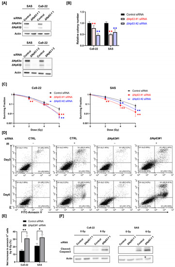 3.1. Effect of ΔNp63 Knockdown on Radiosensitivity and Radiation-Induced Apoptosis of HNSCC Cells
