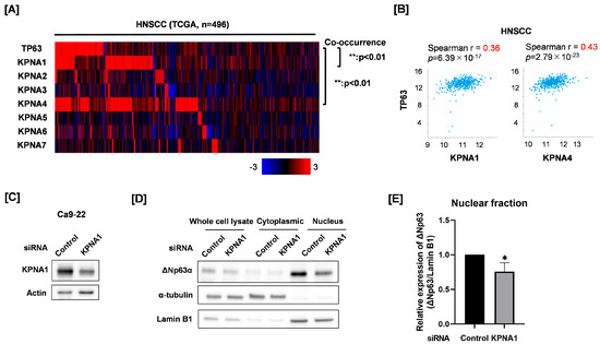 Effect of KPNA1 knockdown on nuclear expression of ΔNp63 in Ca9-22 cells. (A) Co-occurrence between TP63 and each KPNA mRNA expression in the TCGA HNSCC cohort was analyzed through cBioportal. (B) Correlation between TP63 and each of KPNA1 and KPNA4 mRNA in HNSCC from TCGA is shown. (C) KPNA1 protein expression in Ca9-22 cells transfected with control siRNA or siRNA against KPNA1 was analyzed by Western blotting. Actin was used as a loading control. (D) ΔNp63 protein expression in the cytoplasmic and nuclear fractions of KPNA1 knockdown Ca9-22 cells was analyzed by Western blotting. α-Tubulin and Lamin B1 were used as loading controls for the cytoplasmic and nuclear fractions, respectively. (E) Quantitation of nuclear ΔNp63 protein expression in KPNA1 knockdown Ca9-22 cells. The results are shown as relative ΔNp63 protein expression (ΔNp63/Lamin B1). * p < 0.05 vs. control siRNA.