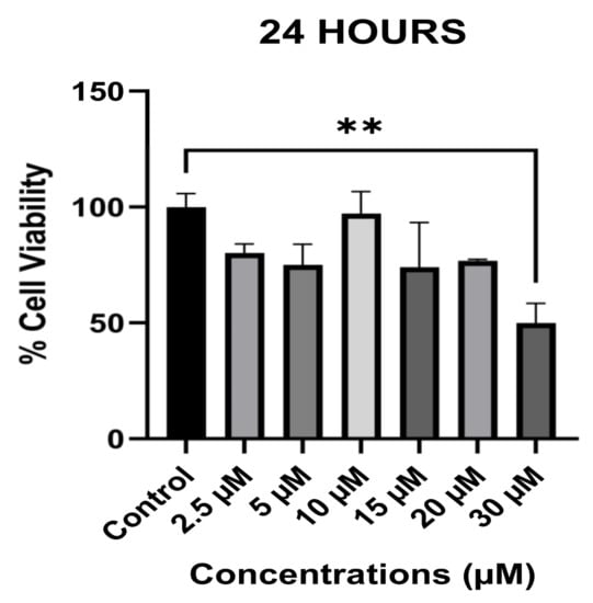 Furthermore, as shown in Figure 1, cell viability decreased to 50.1%, and the percentage of viable cells was 49.9% after 24 h of treatment with 30 µM of avermectin B1a (p = 0.006 **); therefore, the 30 µM concentration was considered as the half maximal inhibitory concentration (IC50). Additionally, our data showed that avermectin B1a did not significantly influence cell viability at concentrations of 2.5, 5, 10, 15, and 20 µM. As a result, our findings indicate that avermectin B1a is most potent against HCT-116 cells at a concentration of 30 µM; consequently, this concentration was selected for use in further experiments.