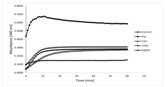 To explore the tubulin polymerization triggered by avermectin B1a, >97% pure tubulin was treated with avermectin B1a and control compounds for 1 h at 37 °C. The proportion of polymerized microtubule components was tracked by measuring the absorbance at 340 nm at regular intervals of 30 s for an hour. It was observed that the compound avermectin B1a had a substantial influence on microtubule polymerization at 30 µM; this influence consisted of increasing the polymerization of mammalian tubulin, which might alter the dynamics of tubulin polymerization and depolymerization and may lead to cell death. Meanwhile, paclitaxel, a well-known microtubule stabilizer, was used to enhance protofilament assembly. As demonstrated in Figure 2, avermectin B1a, like paclitaxel, can stabilize tubulin assembly and might stimulate protofilament assembly, indicating that a potential microtubule stabilizer may be established. Paclitaxel had the highest stimulating activity among the investigated groups, while colchicine was the least active substance in this assay.