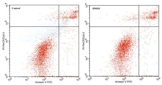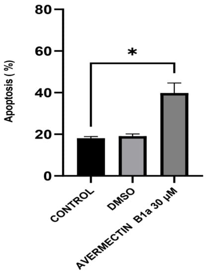 Overall, the presence of apoptotic and necrotic cells can be attributed to the fact that, “unlike” the DMSO group, the HCT-116 cells were exposed to a concentration of 30 µM of avermectin B1a for 24 h. Compared to the untreated cells, the results showed that avermectin B1a significantly promoted apoptosis in the HCT-116 cells (Figure 4) (p < 0.0225 *).
