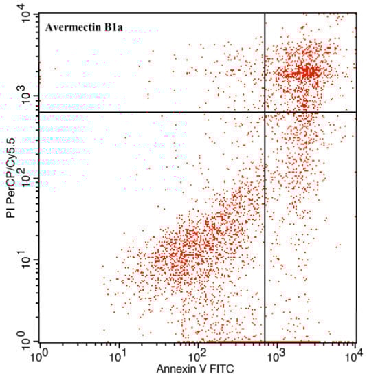 Apoptotic effect of avermectin B1a on HCT-116 cells. The lower left quadrants show live cells, the lower right quadrants show early apoptotic cells, the upper right quadrants show late apoptotic cells, and the upper left quadrants show necrotic cells.