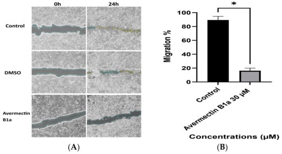 (A) Representative images from in vitro wound-healing assay. HCT-116 cells were treated with 30 µM avermectin B1a and DMSO for 24 h. (B) The summary bar graph represents the percentage of cell migration inhibition after 24 h with treatment. Values are means ± Standard Error (SE) of four replications (p ≤ 0.05 *).