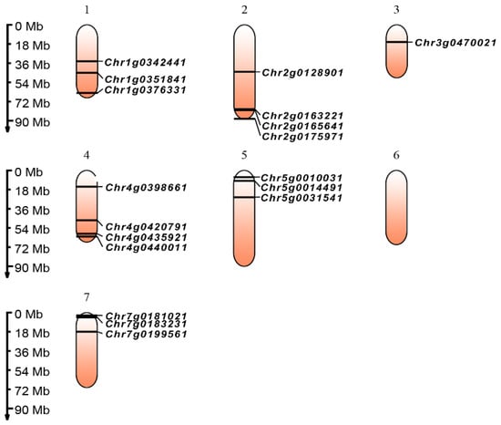 Based on the whole-genome data for the roses, the precise chromosome physical locations of all TCP genes were determined, as shown in Figure 1. The rose genome is composed of seven chromosomes; the lengths of all the rose chromosomes range from 49.7 MB to 90.0 MB. In the chromosome location results of the rose genome, eighteen genes are distributed on six chromosomes, with only chromosome 6 lacking TCP genes. There are four genes on chromosomes 2 and 4, three genes on chromosomes 1, 5, and 7, and only one gene on chromosome 3.