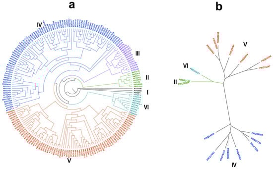 To investigate the TCP genes’ phylogenetic relationship for roses, we applied TCP protein sequences of Malus domestica Golden, Prunus mume, Arabidopsis thaliana, Prunus persica, Prunus dulcis, and Prunus avium to construct the phylogenetic tree. As shown in Figure 2a, 194 TCP proteins were classified into two subclasses (Group A and Group B). We divided Group A into class I–class III and Group B into class IV–class VI. There are three rose TCP proteins in Group A, including two in subclass I and one in subclass III. In Group B, there are seven rose proteins in subclass IV and eight in subclass V. In addition, subclass II in Group A and subclass VI in Group B contain no rose TCP proteins (Figure 2b).