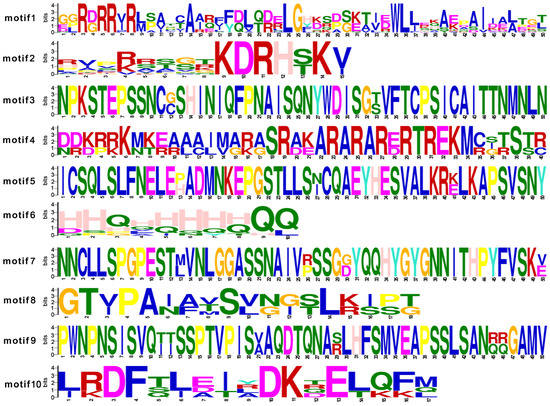 In addition, we used MEME to detect the conserved motifs in eighteen TCP proteins from roses (Figure 3c). Motif 1 and motif 2 correspond to the HXXXD and DFGWG domains, respectively. Motif 6 was found in only 38.9% of the rose proteins belonging to subclasses IV and V. The members of subclass I lacked motifs 3, 5, and 7, while motif 8 was specific to subclass V (Figure 3c and Figure 4). The distributions of conserved motifs within the same branch were similar, and this supports the classification of the evolutionary tree.