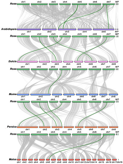 Synteny analysis of the TCP family. Green lines are the syntenic TCP gene pairs for different species. Gray lines are collinear blocks for plant genomes. The species names are Rosa chinensis, Arabidopsis thaliana, Prunus dulcis, Prunus mume, Prunus persica, and Malus domestica Golden, with the respective prefixes ‘Rose’, ‘Arabidopsis’, ‘Dulcis’, ‘Mume’, ‘Persica’, and ‘Malus’.