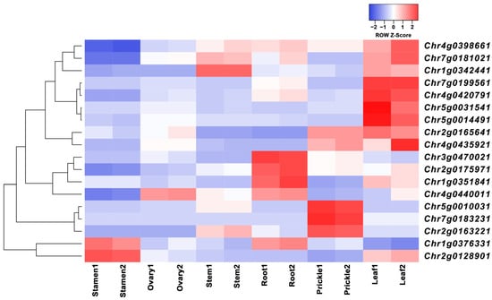 Expression data for the eighteen TCP genes were obtained from the rose transcriptome. The expression clustering analysis of TCP gene members was performed on the leaves, roots, prickles, stems, ovaries, and stamen tissues from R. chinensis “Old Blush”. Figure 6 shows the expression levels of the 18 genes in different tissues, with similar colors indicating similar expression patterns. TCP gene members are mainly expressed in the leaves, prickles, and roots. In the leaves, Chr4g0398661, Chr7g0181021, Chr1g0342441, Chr7g0199561, Chr4g0420791, Chr5g0031541, Chr5g0014491, Chr2g0165641, and Chr4g0435921 exhibit the highest expression levels. In the roots, Chr3g0470021, Chr2g0175971, Chr1g0351841, and Chr4g0440011 are highly expressed, while Chr5g0010031, Chr7g083231, and Chr2g0163221 exhibit the highest expression levels in the prickles, indicating that each tissue has its own specific set of highly expressed TCP genes. In addition, the TCP gene expression level is relatively low in the stems, ovaries, and stamen tissues. In the stamens, only Chr1g0376331 and Chr2g0128901 have high expression levels, and these two genes are also highly expressed in roots and leaves. Chr4g0440011, is highly expressed in the ovaries, while Chr7g0181021, and Chr1g0342441 are expressed in the stems. Some genes are almost not expressed in the ovaries, such as Chr7g0181021, Chr5g0014491, and Chr4g0435921, while these three genes are highly expressed in the leaves. Chr5g0031541 and Chr5g0014491 are only expressed in the leaves, belonging to specific highly expressed TCP genes in the leaves.