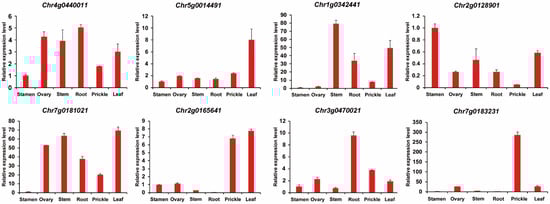 The expression profiles of eight TCP gene family members in different rose tissues, including the roots, stems, leaves, ovaries, prickles, and stamens, were detected using qPCR. Chr7g0181021 was almost not expressed in the stamens and was expressed at the highest level in the leaves, which is consistent with the results of transcriptome and fluorescence quantification. The fluorescence quantification and transcriptome analysis results showed that Chr1g0342441 is expressed at the highest level in the stems and leaves and is almost not expressed in the stamens and carpels, indicating that this gene is mainly expressed in these two tissues. The qPCR results showed that Chr2g0165641 is mainly expressed in the flower and leaf tissues and expressed the least in roots, which is highly consistent with transcriptome analysis results. Chr5g0014491 is mainly expressed in the leaves, according to the qPCR results, while other tissues are poorly expressed. The qPCR results for Chr3g0470021 showed that it is mainly expressed in the root tissue, while Chr4g0440011 is mainly expressed in the ovaries and root tissues. The qPCR results for Chr7g0183231 showed that it is mainly expressed in prickle tissue, while Chr2g0128901 is mainly expressed in the stamen and leaf tissues. These results indicate that the qPCR results are consistent with the transcriptome analysis, and different genes have different expression levels, possibly due to functional differences.