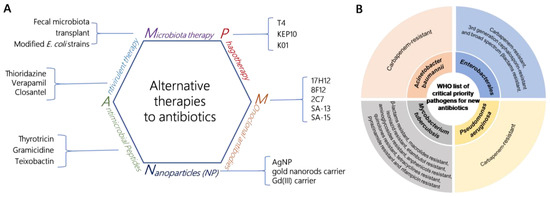(A) Antibiotic replacement therapy strategies; (B) WHO list of critical pathogens for the development of new antibiotics.