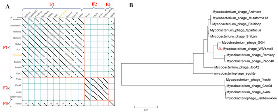 The phage genome was partitioned into clusters and subclusters, using dot mapping. As per Hatfull’s work [35,36], two genomes can be assigned to the same cluster if their sequences in the dot plot exhibit a similarity higher than 50%. Moreover, a cluster can be partitioned into subclusters if the relationships within the cluster are heterogeneous. All the genomes within the same subcluster typically exhibit a greater sequence similarity. The dot-plot results for WIVsmall and other F1 cluster phages indicate that WIVsmall is likely a member of the F1 subcluster (Figure 5A). To investigate the evolutionary position of WIVsmall within the mycobacteriophage family, we conducted the phylogenetic analysis of the tape-measure protein (ORF67), which is the longest gene in the mycobacteriophage genomes. The tape-measure-protein-encoding gene is highly conserved, and serves as a typical phylogenetic marker for mycobacteriophages [37]. The amino acid sequences of the tape-measure protein from WIVsmall, and 14 closely related mycobacteriophages (F1cluster) were aligned. A phylogenetic tree was then constructed, using MEGA X software. WIVsmall was found to be most closely related to SG4, which belongs to the F1 subcluster of mycobacteriophages (Figure 5B).