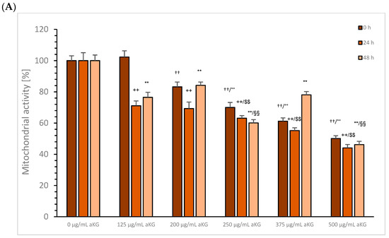 aKG: Aliquots of the cell growth experiments were used to measure mitochondrial activity. Figure 4A shows the mitochondrial activity of MTC-SK cells in absence or presence of different aKG concentrations at 0, 24, 48, and 72 h. After 24 h incubation with 200, 250, 375, and 500 µg/mL aKG, there was a significant decrease in the mitochondrial activity of MTC-SK cells compared to the control (100 ± 3.1%; n = 5); using 200 µg/mL aKG the mitochondrial activity decreased to 83.2 ± 3.1% (n = 5; p < 0.01), while the concentration of 250 µg/mL aKG led to a decrease to 70.0 ± 3.2%, (n = 5; p < 0.01), 375 µg/mL aKG led to a decrease to 61.2 ± 2.1%, (n = 5; p < 0.01), and 500 µg/mL aKG led to a decrease to 50.1 ± 1.8% (n = 5; p < 0.01). The lowest concentration of 125 µg/mL aKG (102.3 ± 4.0%; n = 5) had no effect on the mitochondrial activity of MTC-SK cells.