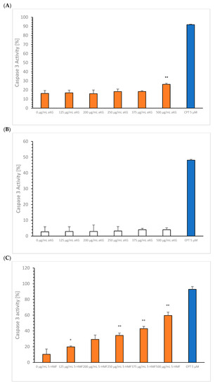5-HMF: Figure 7C shows that 125 µg/mL 5-HMF led to a significant increase in the caspase-3 activity compared to the control (19.8 ± 1.5% vs. 10.3 ± 0.9%; n = 5; p < 0.01). Increasing the 5-HMF concentration to 200 µg/mL led to a significantly higher caspase-3 activity of 29.2 ± 0.8% (n = 5; p < 0.01) compared to the control, followed by 250 µg/mL 5-HMF, 34.2 ± 1.9% (n = 5; p < 0.01), 375 µg/mL 5-HMF, 42.9 ± 0.8% (n = 5; p < 0.01), and 500 µg/mL 5-HMF, 59.6 ± 2.4% (n = 5; p < 0.01). No caspase activation was measured using all 5-HMF concentrations on NCI-H23 cells (Figure 7D).