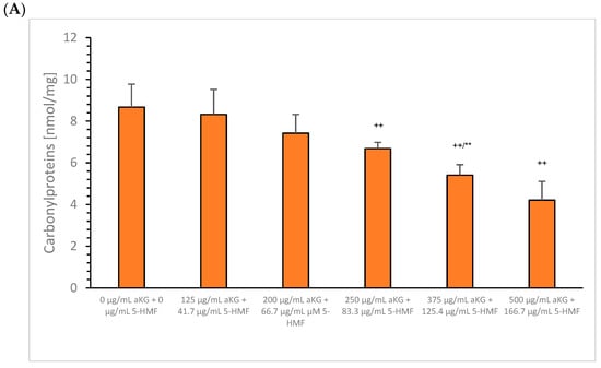 Figure 8A shows the content of oxidatively modified proteins in the membrane of MTC-SK in presence or absence of different aKG + 5-HMF concentrations after 72 h. Incubation of 250 µg/mL aKG + 83.3 µg/mL 5-HMF reduced the carbonylated protein content significantly to 6.7 ± 0.3 nmol/mg (n = 3; p < 0.01) compared to the control (8.7 ± 1.1 nmol/mg; n = 3), followed by 375 µg/mL aKG + 125.4 µg/mL 5-HMF (5.4 ± 0.5 nmol/mg; n = 3) and 500 µg/mL aKG + 166.7 µg/mL 5-HMF (4.2 ± 0.9 nmol/mg; n = 3). The usage of several combined aKG + 5-HMF solutions showed no significant effect on NCI-H23 cells (Figure 8B).